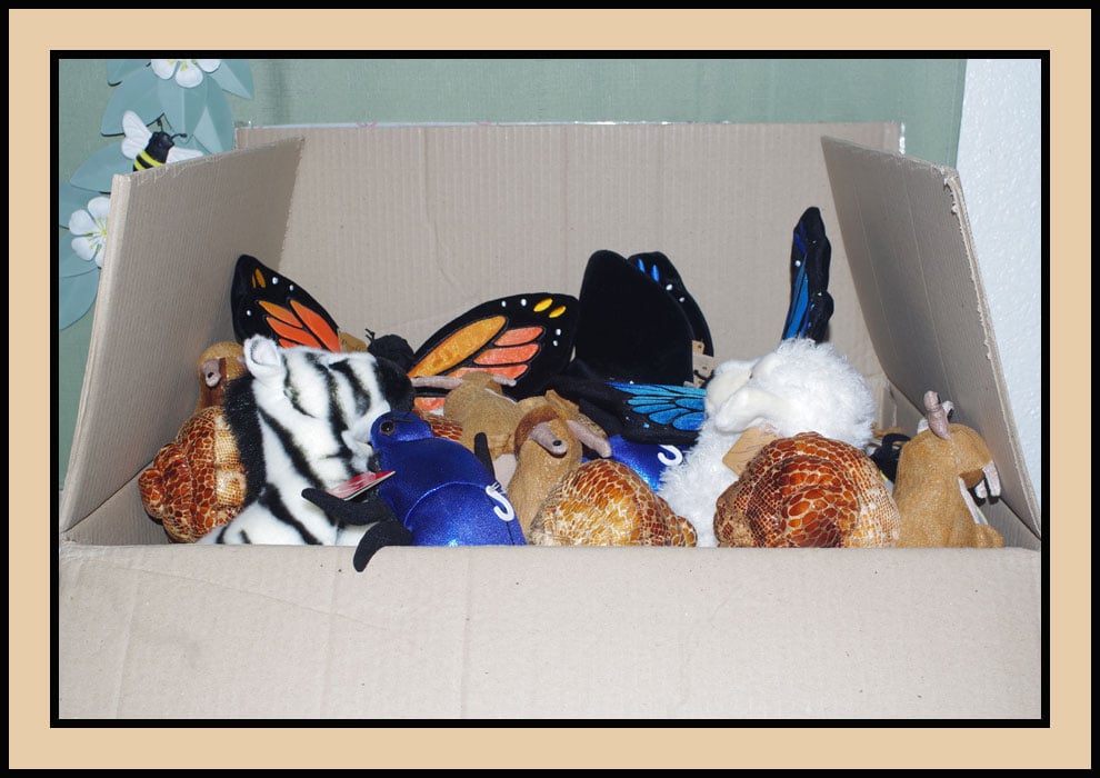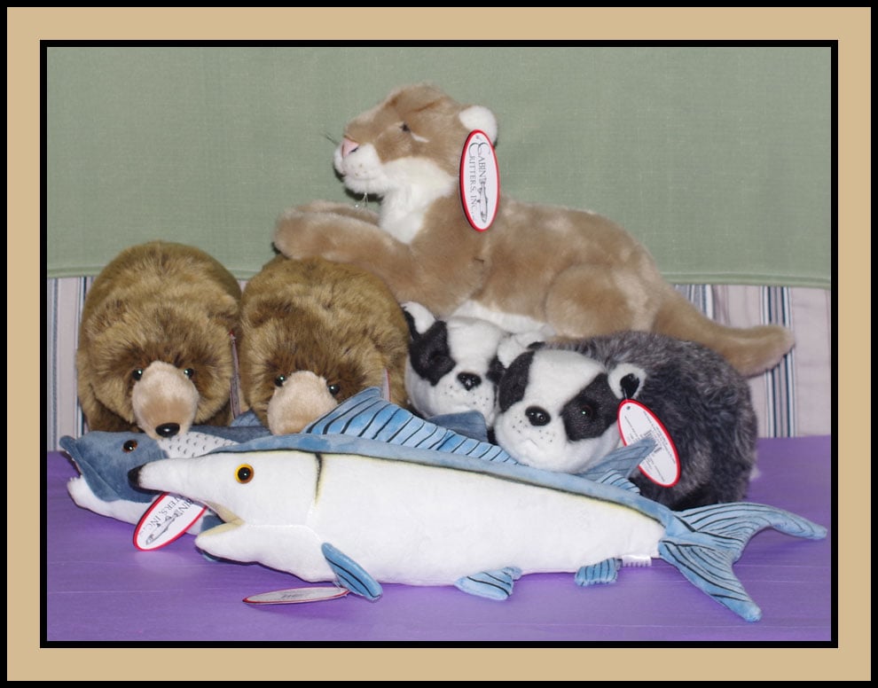 Our selection is so diverse (we are simply stuffed with “stuff”, but then “stuff” is what we do!) in order to keep track of everything we have resorted to arrangement by habitat! When you visit (by now you know you have to if you can…) you will eventually notice that our entire shop is suggestive of the interior and exterior of a gigantic fantastic playhouse or dollhouse. “Inside” live authentic Raggedy Ann and Andy, Sesame Street characters, etc. Also living the pampered “indoor” life are plush Cats and Teddy Bears “Outside” you will find our rather extensive collection of realistic Dog Breeds (this is a personal favorite category of ours, so if someone makes a decent version of a specific breed, we will try to have it for you!), Barnyard Animals, Horses, Frog and Turtle ponds, Forest critters, Desert animals, Birds, and creatures of Central and South America, Australia, Africa and Asia as well as an area devoted to Ocean life! There is even a section “inhabited” by the fantasmagorical creatures of the imagination including dragons, faeries, unicorns and the like!